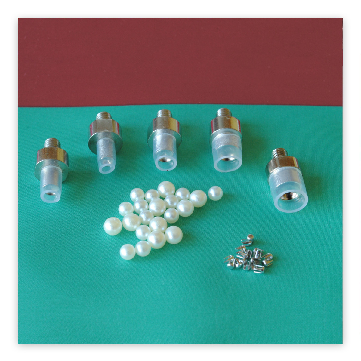 Машинката за поставяне на перли с нит се предлага в комплект с 5бр накрайника за различни размери перли.